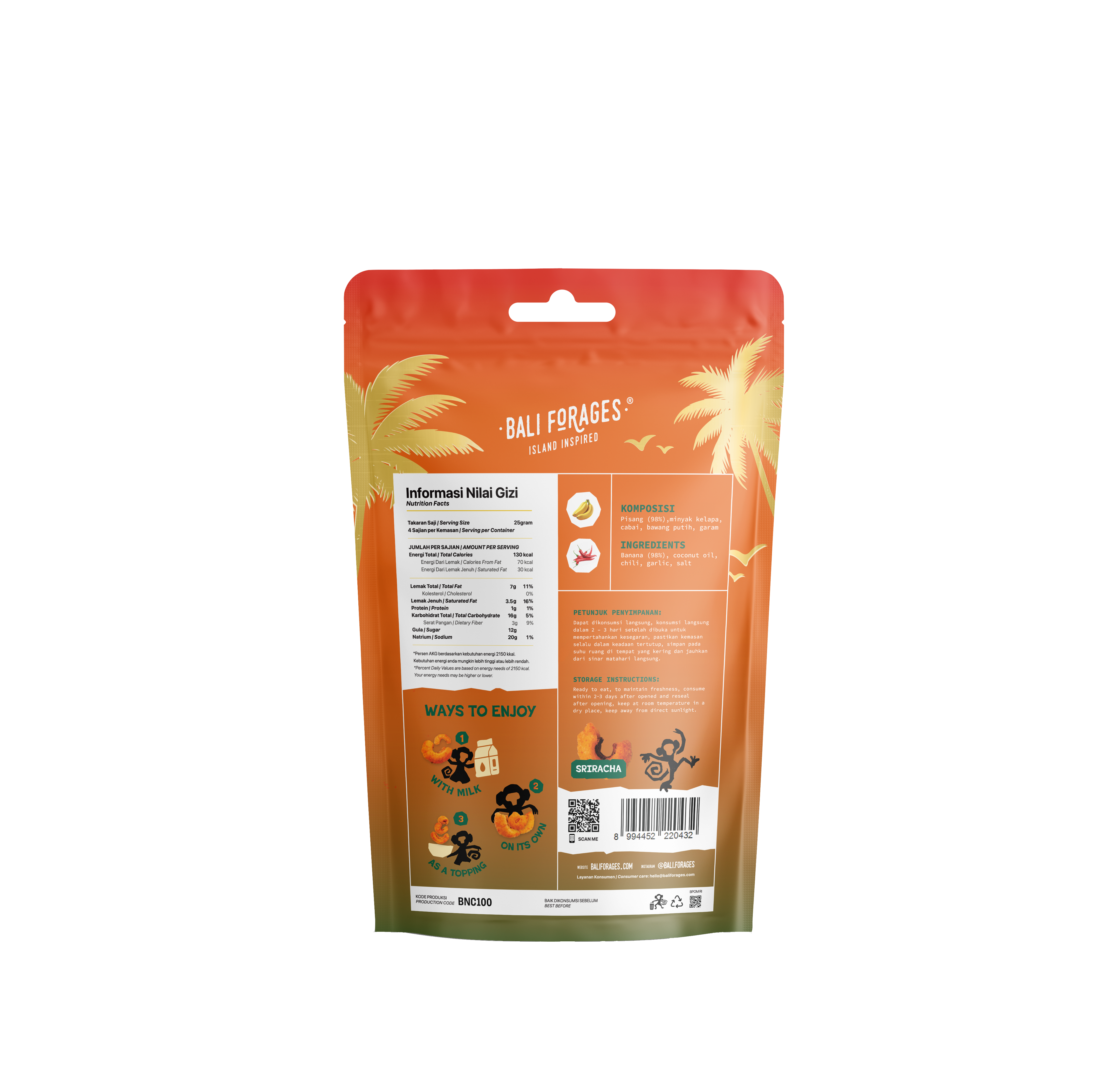 Imagine for a moment chicharrones or rambak — but made entirely from wild bananas. Light, airy, and unexpectedly crispy, Banana Crunch is a whole new kind of banana snack. This bold Sriracha version brings the heat, with minimal, all-natural ingredients and nothing artificial. No added sugar, no preservatives — just clean, savory spice in every bite.