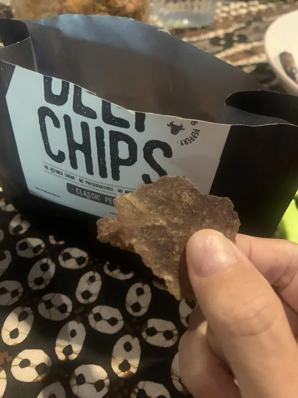 Imagine for a moment a potato chip and beef jerky having a love child and, voilà, beef chips were born! Thinly sliced, crispy, and crunchy. A perfect blend of black and white pepper with a bit of spice.